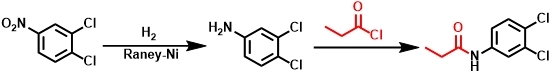 工业上敌稗的合成是通过用雷尼镍将硝基加氢得到3,4-二氯苯胺。胺与丙酰氯的酰化反应产生敌稗,产物为白色或棕色晶体。酰氯的工业合成工艺复杂,成本高昂。相比于工业上的方法,我们生产扑热息痛和敌稗的优势是:绿色(纳米催化材料;氢气还原剂;无任何有机添加剂),原料稳定/不易变质(比胺稳定的硝基)。该研究成果将显著推动绿色制备酰胺药物分子等高端化学品。