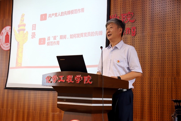 大会最后由学院党委书记庞国伟主讲专题党课。庞国伟书记以《做“硬核”党员,让党旗在抗“疫”一线高高飘扬》为题,从党章中关于先锋模范作用的表述,先锋模范作用的具体表现,战“疫”中如何发挥党员的先锋模范作用等几个方面进行了详细讲解。他说到,党员的先锋模范作用就是“党员在人民群众中应该产生的影响,即在生产、工作、学习和一切社会活动中,通过自己的骨干、带头和桥梁作用,影响和带动周围的群众共同实现党的纲领和路线的行动”。在谈到如何发挥党员的先锋模范作用时,庞书记结合学院师生身边的战“疫”故事对先锋模范作用的发挥提出了具体要求,希望全体党员能够争当急先锋、争当引导员、争当排头兵、争当保护者和争当领跑者,以先进典型为榜样,以“我是党员我先上”的责任担当,自觉同以习近平同志为核心的党中央保持高度一致,为坚决打赢疫情防控阻击战而努力奋斗!