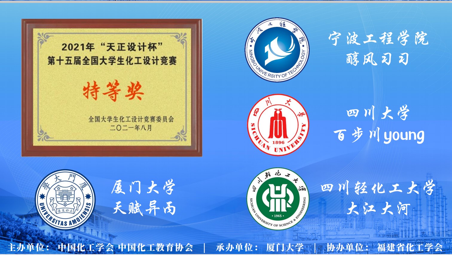 2021年“天正设计杯”第十五届全国大学生化工设计竞赛全国总决赛于8月16日~8月22日在线上举办,由厦门大学承办。经过初赛、赛区决赛,西南赛区、华北赛区等七个赛区共60支队伍突出重围,进入全国总决赛,参与最终角逐。受新冠肺炎疫情影响,今年全国总决赛专项评审、答辩环节采用线上的方式进行,经过专项评审、第一轮答辩、第二轮答辩,“百步川young”团队不惧强敌,凭借饱满的工作量、高质量的设计作品、清晰流畅的现场答辩,以0.1分的微小差距惜败于浙江大学,排名全国第四名,并获得了全国特等奖的殊荣。本次竞赛,我校楼凤