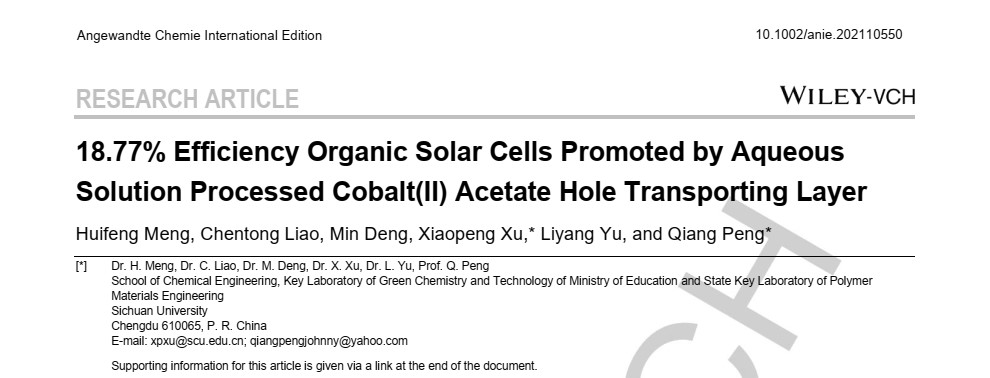 彭强教授课题组在Angew. Chem. Int. Ed.上发表题为“18.77% Efficiency Organic Solar Cells Promoted by Aqueous Solution Processed Cobalt(II) Acetate Hole Transporting Layer”的研究论文。该课题组开发了一种基于醋酸钴的新型空穴传输层材料及其水溶液绿色制备工艺,将有机太阳能电池二元器件的能量转换效率提高到目前最高的纪录18.77%。楼凤