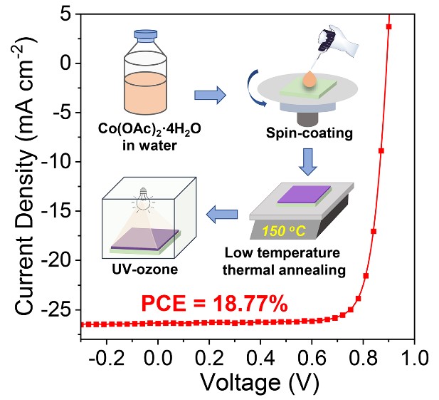 彭强教授课题组以低成本的Co(OAc)2·4H2O为原料,简单制备出了一种高效耐用的空穴传输层材料。该制备工艺是将Co(OAc)2·4H2O水溶液涂布在透明ITO电极上,通过热退火除去其中的结晶水,并通过紫外臭氧处理使该空穴传输层部分氧化,显著增加其功函数。此工艺所制备的基于钴的空穴传输层具有良好的光透过率、高的导电性以及低的表面缺陷,促使所制备的有机太阳能电池的开路电压、短路电流密度、填充因子都显著提升,最终获得了高达18.77%的能量转换效率,是目前有机太阳能电池二元共混器件效率的世界记录。该空穴传输层的制备条件工艺简单、成本低廉、适用于PET等柔性基底,具有制备大面积柔性器件的潜力。