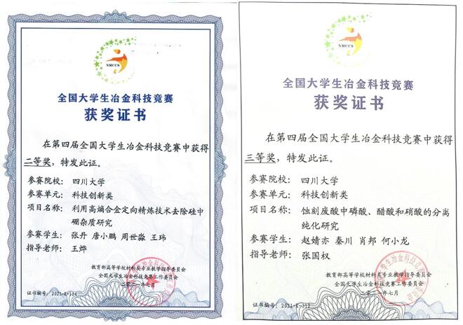 张国权副教授指导的赵婧亦、秦川、肖邦、何小龙团队凭借参赛作品《蚀刻废酸中磷酸、醋酸和硝酸的分离纯化研究》荣获全国三等奖。