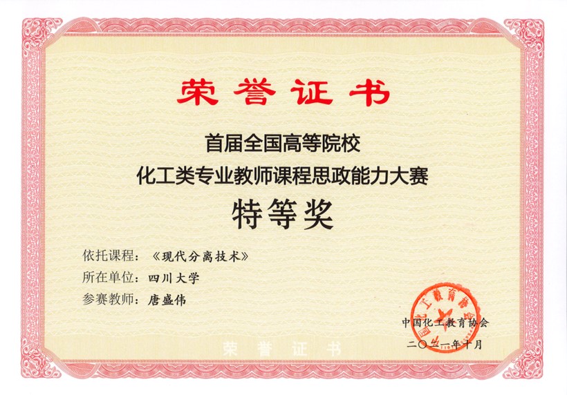 基层教学组织教研项目中获得校级立项。《制药工程导论》《近代化学基础-无机部分》《制药分离工程》《近代化学基础》4门课程获批省级一流课程。学院教师获2021年全国高等院校(本科)化工类专业教师课程思政能力大赛特等奖1项、二等奖1项。获2021年全国化工类专业优秀课程思政案例视频一等奖、二等奖各1项,课件二等奖1项。