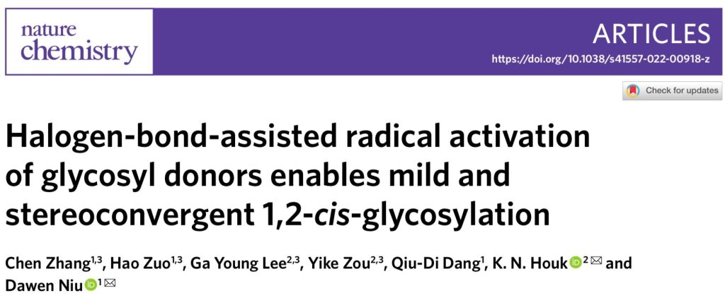 钮大文教授团队与加州大学洛杉矶分校Houk团队合作在Nature Chemistry上发表了一篇题为“Halogen-bond-assisted radical activation of glycosyl donors enables mild and stereoconvergent 1,2-cis-glycosylation”的研究工作[1]。楼凤