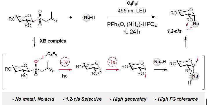图1:卤键/氢键协助的糖供体自由基活化策略实现1,2-顺式糖基化反应。