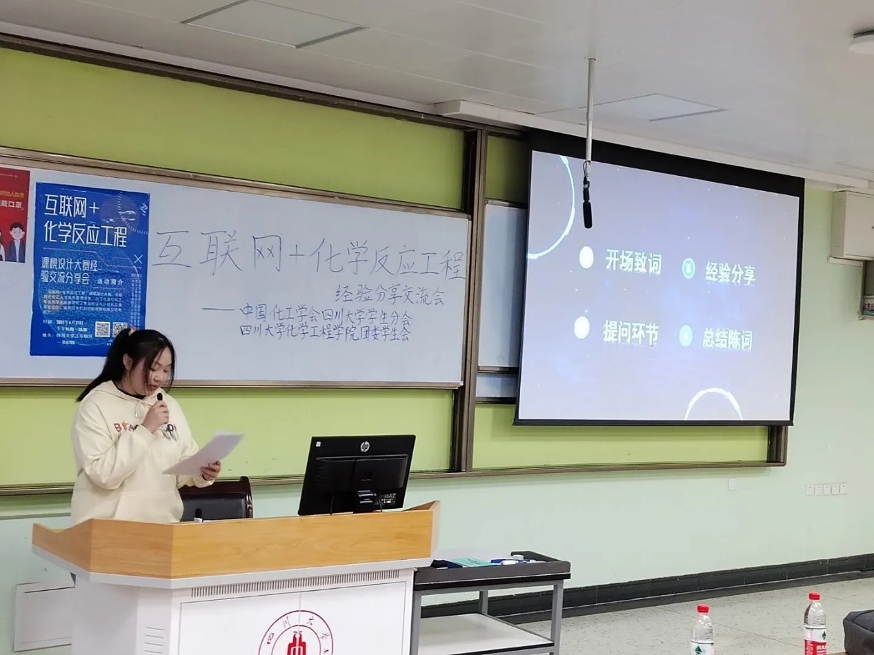 活动伊始,主持人胡雯旗同学简单介绍了第五届“互联网+化学反应工程课模设计大赛”相关信息和我校在第四届比赛中所取得的成绩,并介绍了参与分享的三个获奖团队。接着,唐思扬老师向在场同学提出了指导性意见,她表示参赛的意义在于个人理论运用能力与创新能力的提升,鼓励在场的学生积极参与反应工程课模设计大赛和化工设计大赛。随即开始获奖团队的经验分享。