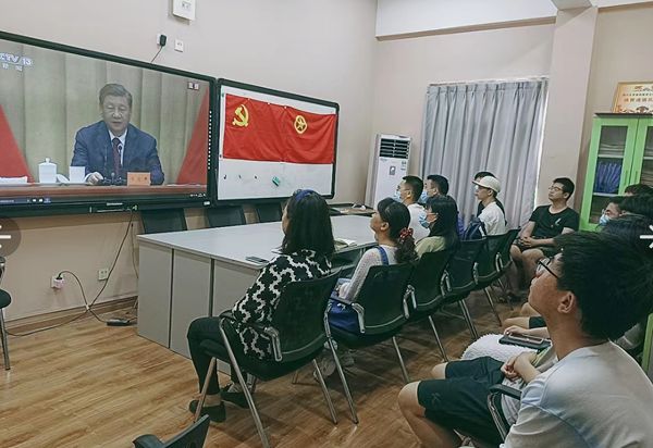 在江安校区以学院学工组三舍活动室为中心,以学生寝室为网格点,形成化工学子学习重要讲话精神的全覆盖学习网,来推进学生社区的精神引领阵地建设,激励广大化工团员学子在实现中华民族伟大复兴中国梦的新征程上奋勇前进。在学院学工组三舍活动室内,学院党委副书记姜利寒老师、辅导员司振兵老师、李珍珍老师、李忆雯老师以及数十名党员、团员代表,共同认真收听收看热烈庆祝中国共产主义青年团成立一百周年的直播活动。此外,很多学生纷纷自发在寝室内观看,累计参与达500余人次。