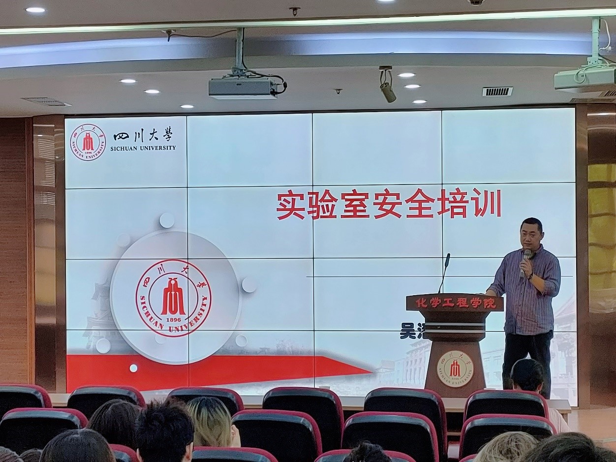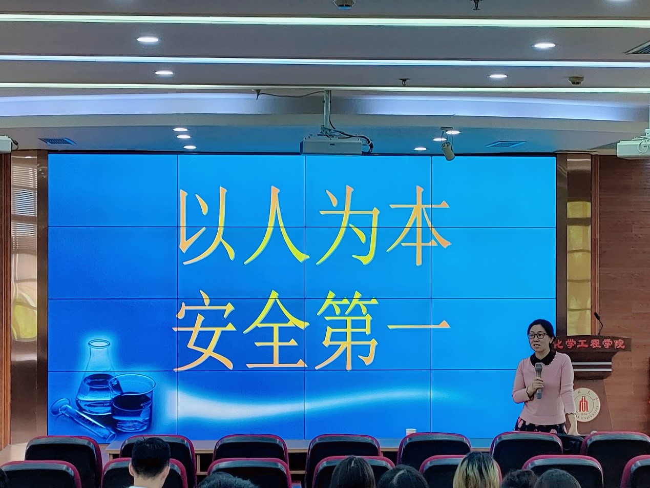 的学科特点,着重讲解了实验操作人员必须具备的安全素质和意识,包括实验操作前要熟悉操作流程、检查周围环境、制定应急预案;实验过程中要遵守操作流程,带好防护工具;面对化学实验可能会发生的事故应如何处理以及对实验室可能存在的安全隐患定期排查等。最后吴潘老师对同学们提出了“以人为本,安全第一”的期望和要求。