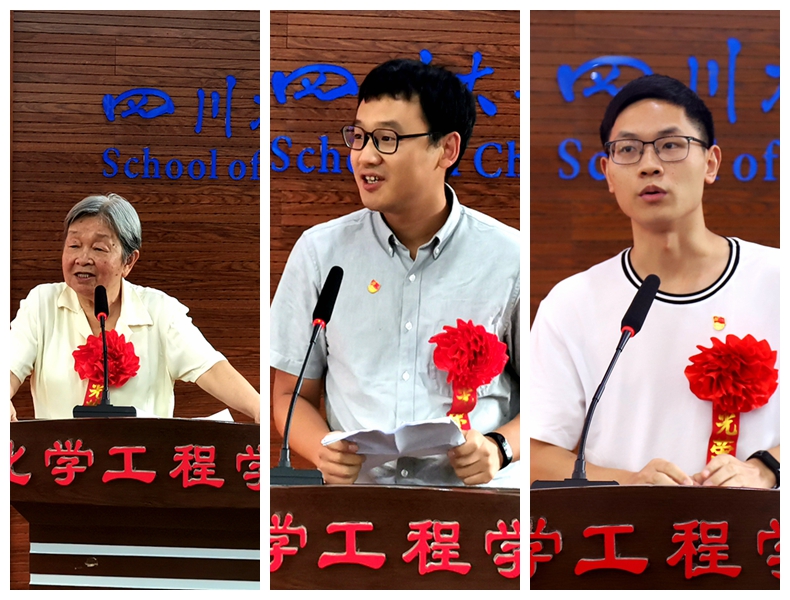 杰出教授、老党员钟本和教授作为“优秀共产党员”代表发言,带领大家一起回顾了曾经的入党初心和开展“料浆法磷铵”技术攻关的困难和坚持,并表示会永远保持学习的热情,离休不离岗,做一颗永不生锈的螺丝钉,生命不息、奋斗不止,继续为学院做出新的贡献;优秀党务工作者代表、青年教师谭帅同志从坚定理想信念、牢记立德树人使命和提升业务水平与科研能力等方面表示要以“四有”好教师为标准,不忘教育初心,坚守教师使命;先进党支部代表、研究生过程装备与安全科学党支部书记邓松同志结合“全国百个研究生样板党支部”的创建过程,分享了支部“有政治高度、有凝聚力度、有服务精度、有育人深度”的“四有制度+”建设理念和实践,并表示会努力让支部成为滋养党员成长成才的沃土,培养更多优秀党员。