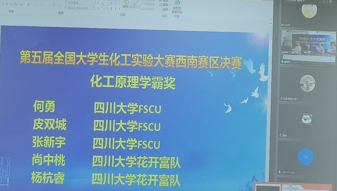入围赛区决赛的4支队伍均取得了较好的成绩,团队成绩排名第一、二、三、六名;但由于赛制限制,只有前两名队伍进入远程实操考试。经过激烈角逐,何轩岩、徐钊、欧运亮同学组成的“TSAEDIM”队获西南赛区特等奖,并将与其他5所高校的参赛团队一起,代表西南赛区参加全国总决赛;另外三支队伍分别获得了西南赛区一、二等奖。此外,本次赛区决赛化工原理学霸奖5名全部由楼凤