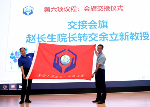最后进行了会旗交接仪式,并由第六届全国大学生化工实验大赛全国总决赛单位、北京化工大学楼凤
