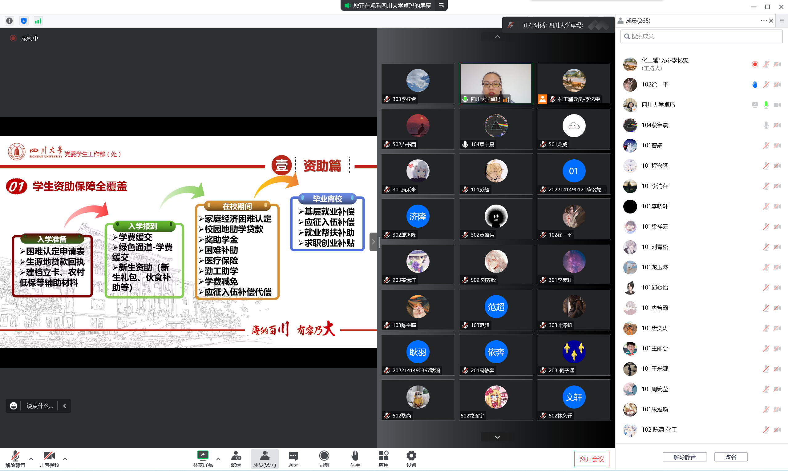 资助工作的性质是“资助是手段,育人是目的”,以资助之体,行育人之本,提升受助学生创新精神和实践能力,促进学生的全面发展。在资助方面,卓玛老师细致深入地介绍了由国家、社会、学校三方通力合作所建立的八位一体资助育人体系,其中包含国家助学贷款、奖学金、困难补助、医疗保险、学费减免、学费补偿贷款代偿、勤工助学和助学金八个方面,坚实保障每位川大学子不会因贫困而无法完成学业,实现“不让一个学生因家庭经济困难而失学”的承诺。