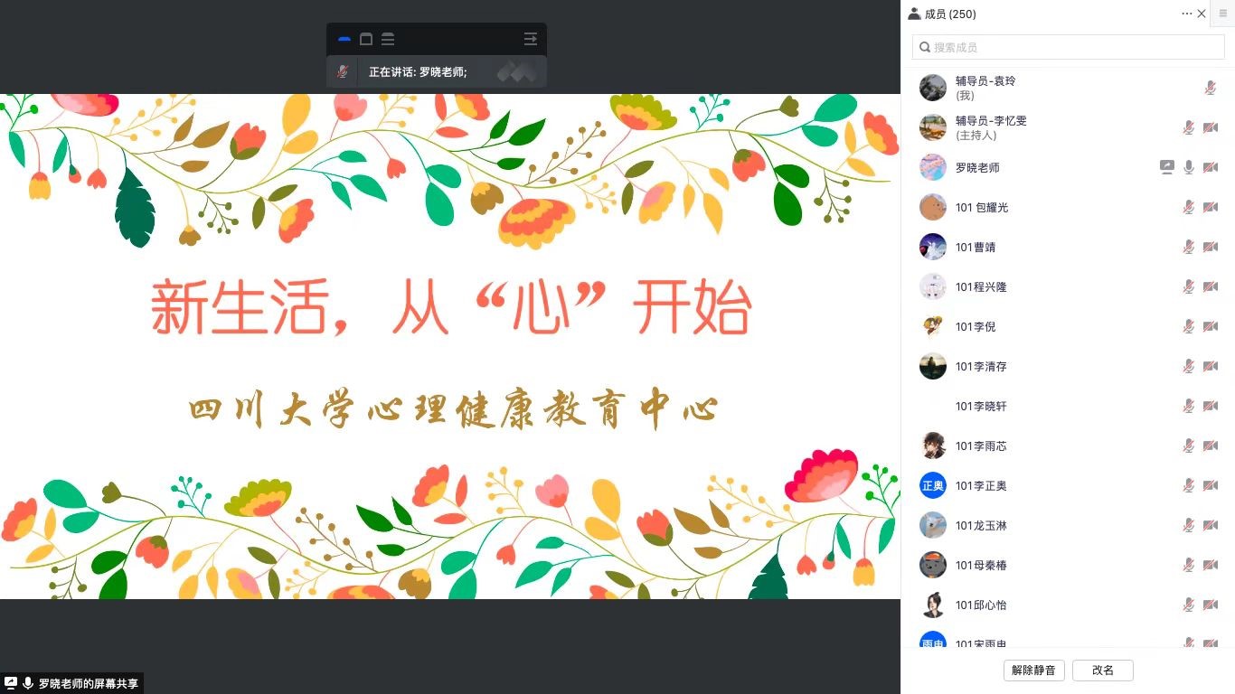 2022级新生带来了以“新生活,从‘心’开始”为主题的心理健康讲座。因疫情原因讲座于线上举行,全体2022级新生和新生辅导员李忆雯、袁玲老师共同参与了本次活动。