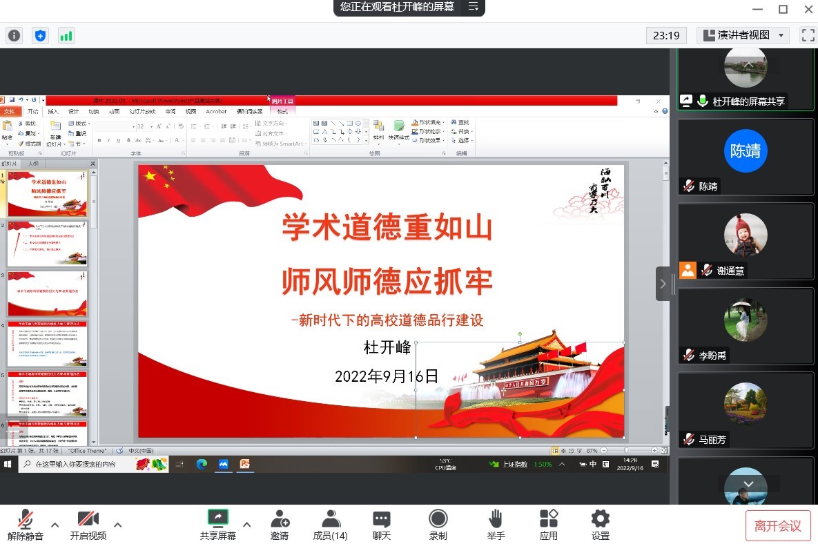 杜老师首先带领大家学习了教育部制定的《高等学校预防与处理学术行为不端行为办法》文件精神,接着分享了高校师风师德建设和警示相关的典型案例,最后结合《中国共产党章程》,对于严肃党风党纪,恪守清正廉洁,以及高校教师要做好党风廉政建设和保持良好的师风师德的重要性和要求进行了阐述。