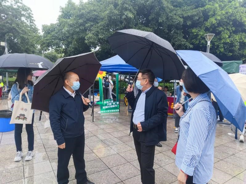 副校长梁斌(右)走访新生报到点
