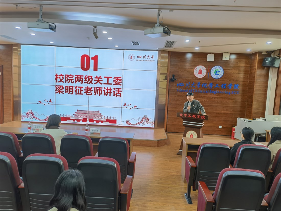 前辈们在化工行业发展的引领作用为例,给同学们介绍了他们为化工行业做出的贡献,让我们感受到他们锲而不舍、追求真理的精神。“理想信念是精神之钙”,梁老师之后就新时代青年所面临的责任和使命作了阐述,号召同学们明确自己作为新时代青年的责任和义务,坚定理想信念,增强爱党爱国情怀和砥砺前行的信心。最后以自身经验为基础,勉励同学们在研究生阶段平衡好学习与工作,理论联系实际,在实践中锻炼自己的本领。