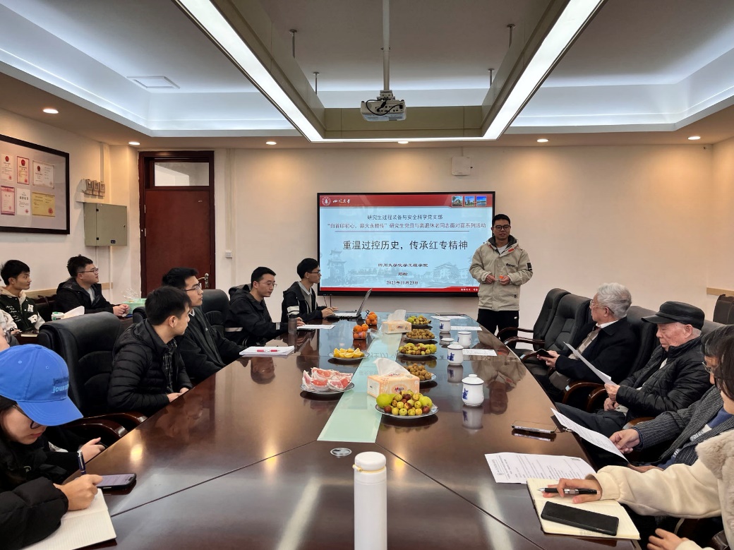 为推动学习贯彻习近平新时代中国特色社会主义思想主题教育走深走实,促进学科特色与党建融合一体化推进,以专业发展历史之伟力增强支部同志对过程装备与控制工程专业的认同感和自豪感;同时发挥样板党支部在探索党建与科研相融合方面的先锋模范作用,促进支部同志和离退休老同志之间的交流,传承老一辈过控人的又红又专精神,研究生过程装备与安全科学党支部组织全体党员于2023年11月23日下午14:30在化工楼235会议室开展“白首印初心,薪火永相传”研究生党员与离退休老同志面对面——重温过控历史,传承又红又专精神主题活动,本次活动邀请了校院两级关工委梁明征老师、学院关工委卫永祉老师、闫康平老师和陈志老师,以及研究生辅导员杨秀英老师,活动现场由辅导员邓磊老师主持。