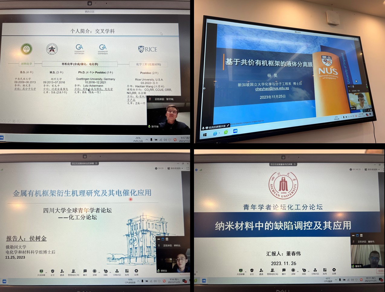 接着,来着美国莱斯大学的张守坤博士、新加坡国立大学的杨昊博士、美国俄勒冈大学的侯树金博士、阿卜杜拉国王科技大学的董春伟博士,以及德国马克思普朗克煤炭研究所的郑添裕博士为大家带来了精彩的学术报告,并就报告中的一些研究成果积极开展讨论。