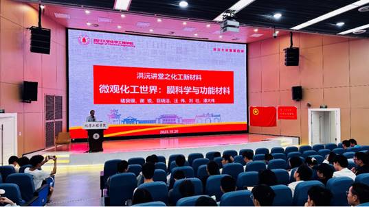 江安校区水上报告厅,参加了洪沅讲堂第四讲“微观化工世界:膜科学与功能材料”的交流讲座。参加本次讲座的嘉宾有楼凤