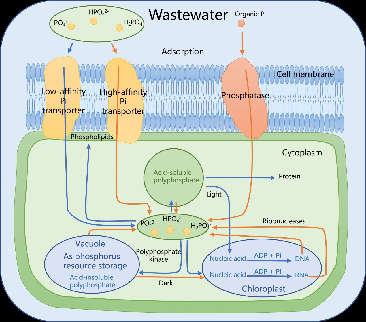 图2微藻可能的磷吸收途径。蓝线:磷充足条件;橙线:缺磷条件。