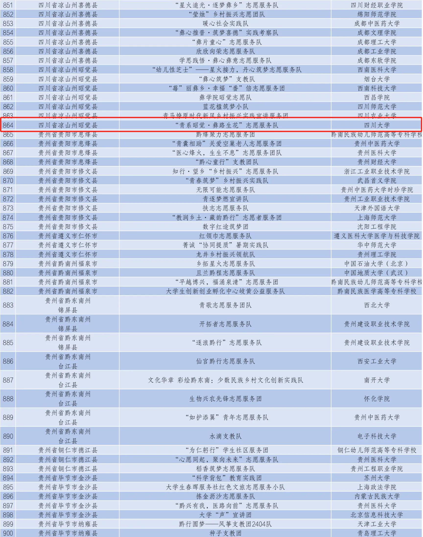 图为2024年全国大学生“乡村振兴”志愿服务队录取名单(节选)
