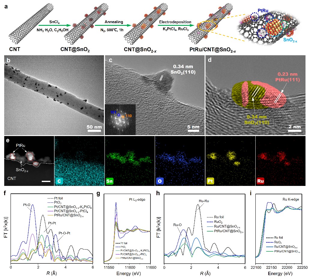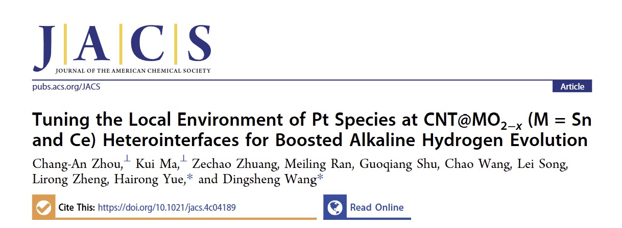 岳海荣教授团队与清华大学王定胜教授团队合作提出了一种高效复合结构(PtRu/CNT@MO2-x)碱性HER催化剂的设计策略。通过氧化物载体优化、Pt物种调控和修饰,改善催化剂导电性和调控异质界面局域环境,平衡了活性位点上H吸脱附、H2O吸附和解离行为,实现了碱性介质中的Volmer反应和H*脱附动力学同步加速,从而增强了Pt基催化剂的碱性HER性能。相关工作以“Tuning the Local Environment of Pt Species at CNT@MO2-x(M = Sn and Ce) Heterointerfaces for Boosted Alkaline Hydrogen Evolution”发表在国际顶级期刊《Journal of the American Chemical Society》。楼凤