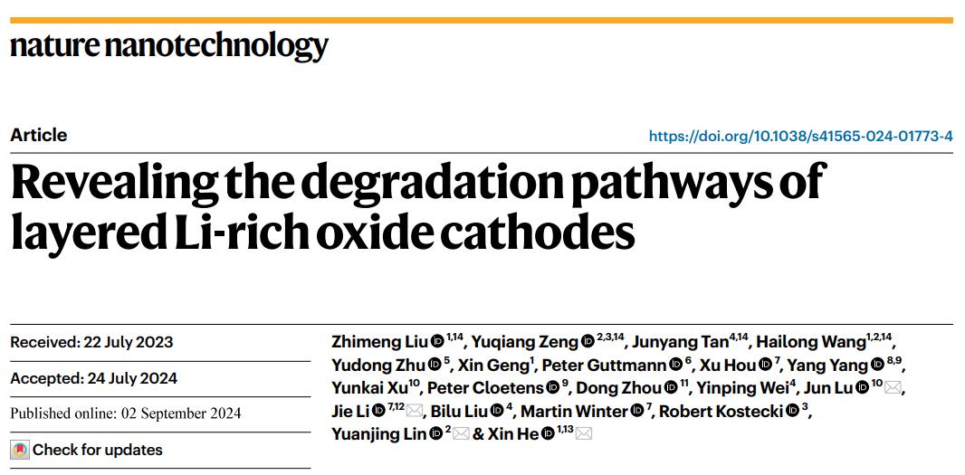 何欣研究员团队在国际知名期刊Nature Nanotechnology上发表题为Revealing the degradation pathways of layered Li-rich oxide cathodes的研究文章。通过整合形貌、结构和从单个原子的氧化态演化到次级颗粒的分析,经过纳米尺度到微尺度的表征,确定了与颗粒内非相反应相关的不同结构变化途径。