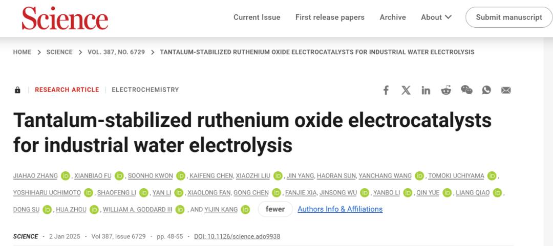 William A. Goddard教授团队在《Science》发表了题为“Tantalum-stabilized ruthenium oxide electrocatalystsfor industrial water electrolysis”的文章。楼凤