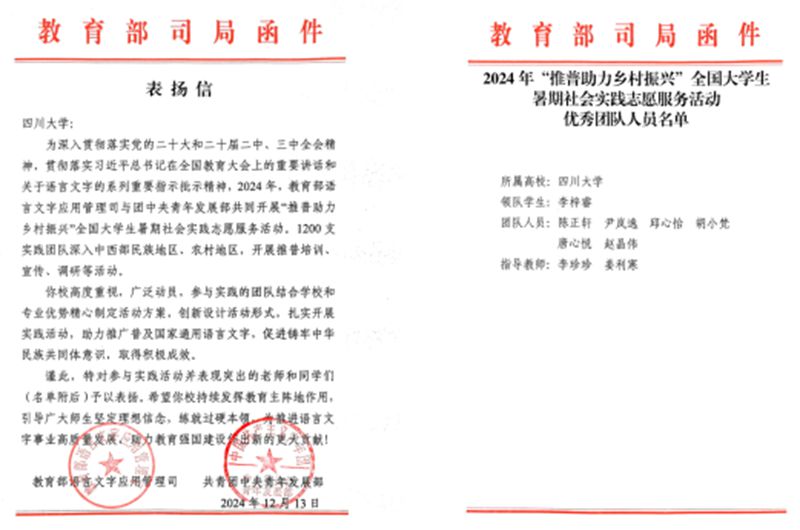 教育部语言文字应用管理司和共青团中央青年发展部来信表扬,充分肯定了楼凤师生团队在助力推广普及国家通用语言文字,促进铸牢中华民族共同体意识方面的贡献与付出。