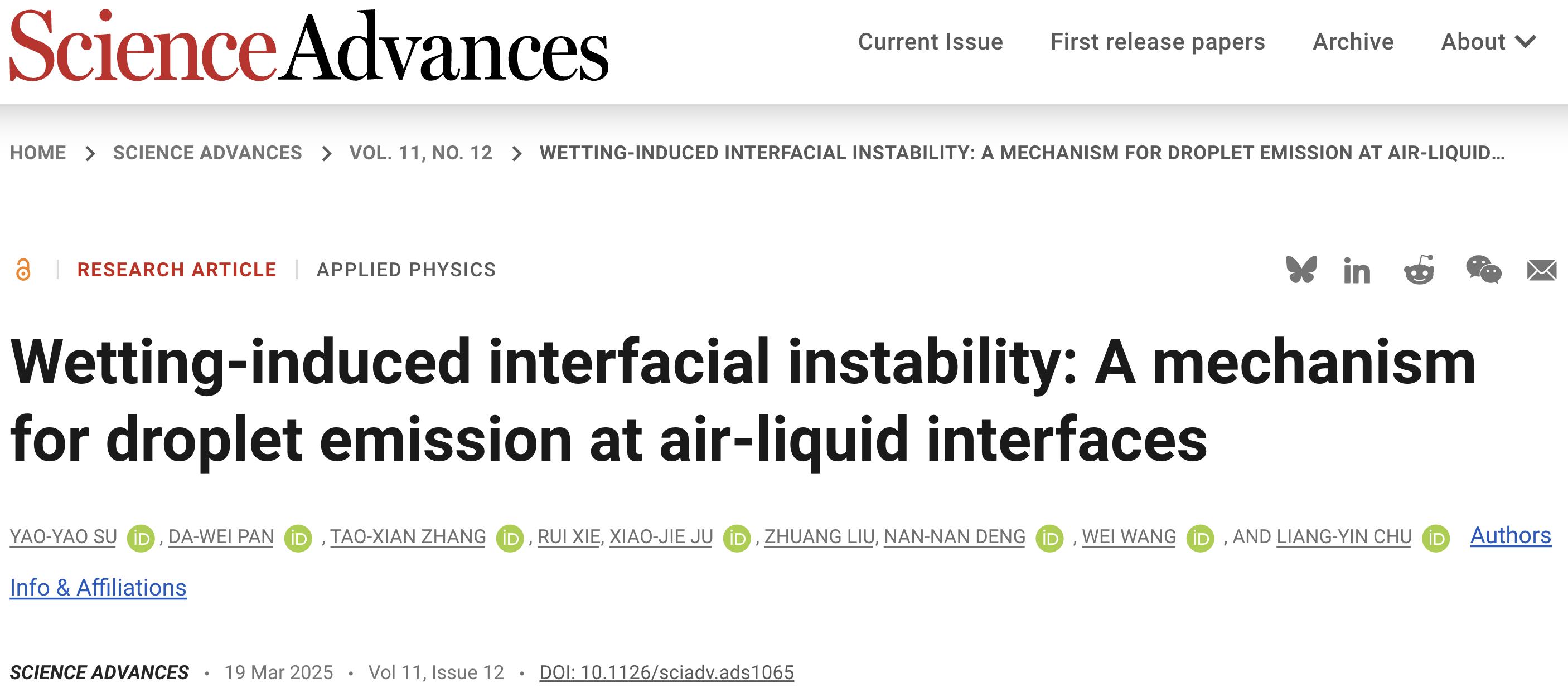 褚良银教授、汪伟教授团队与合作者在液滴微流控领域取得新进展,相关成果“Wetting-induced interfacial instability: A mechanism for droplet emission at air-liquid interfaces”发表于《Science Advances》期刊。楼凤