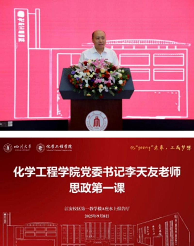 党委书记李天友在江安水上报告厅,以“着眼未来,把握当下,走出精彩的大学人生路”为题,开展“2025级化工新生思政第一课”活动,引导和鼓励2025级化工学子开启又红又专的大学学习成长之路。