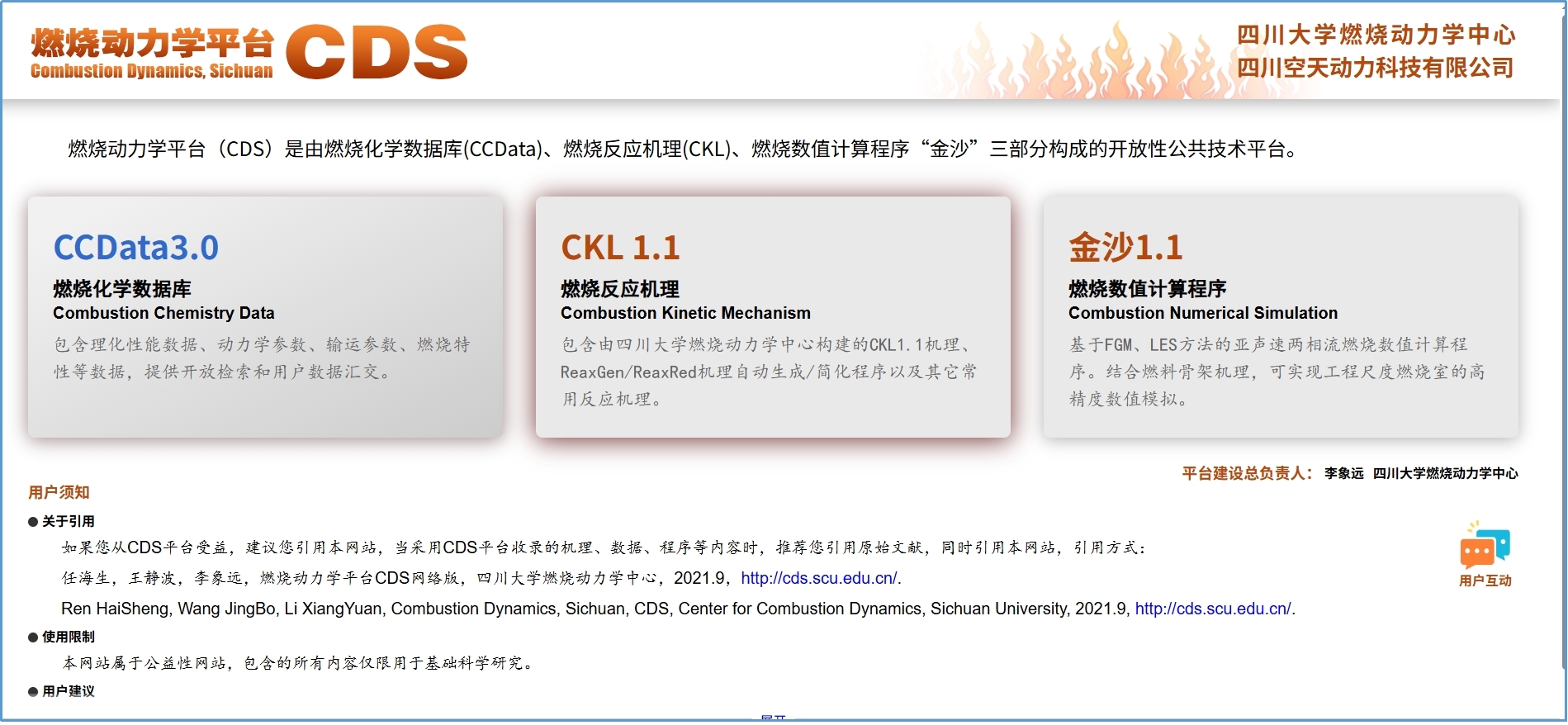 CDS平台以数据自主安全可控和完整性为长期目标,CCData于2021年10月发布2.0版本,2023年3月升级为2.1版本。2.1版增加了热力学、动力学数据及临界参数板块,引入了SMILES唯一性检索功能。CDS平台的燃烧反应机理(CKL)和燃烧数值计算程序“金沙”两个板块正在持续开展数据和功能扩充优化,楼凤