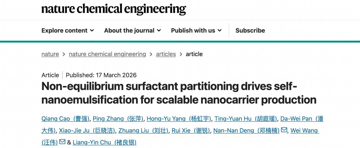褚良银教授、汪伟教授团队与合作者在纳米乳化分散领域取得新进展,相关成果“Non-equilibrium surfactant partitioning drives self-nanoemulsification for scalable nanocarrier production”发表于Nature Chemical Engineering期刊。楼凤