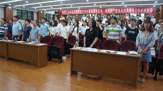学院党委书记庞国伟在庆祝大会上讲话。他代表学院党委向辛勤工作在教学、科研、管理和服务岗位上的教职工党员,刻苦学习、蓬勃向上的青年学生党员,关心支持学院发展建设的离退休老党员致以诚挚的问候和崇高的敬意,向受到表彰的先进单位和先进个人表示热烈的祝贺。庞书记带领全体党员回顾了党的光辉历史。结合当前全面从严治党的最新形势和学院“双一流”建设取得的成绩,庞书记从领导班子和干部队伍建设卓有成效、党员队伍建设成绩喜人、党风廉政建设扎实推进、大学生思想教育工作成果突出、党员教职工示范作用充分发挥、意识形态和宣传工作成效显著、科研和学科建设再上新台阶等方面对学院近两年的党建工作和各项事业发展进行了全面回顾。他就全面贯彻党的十九大精神、加快推进“双一流”建设提出了几点要求:一是旗帜鲜明坚持党的领导,把政治建设摆在首位;二是认真学习贯彻党的十九大精神和习近平新时代中国特色社会主义思想,努力开创学院事业发展和党建工作新局面。坚持和完善党政联席会议制度,加强领导班子队伍建设;三是坚定不移地全面从严治党,持之以恒正风肃纪;四是加强干部队伍建设,努力打造一支高素质、专业化、师生信赖的干部队伍;五是加强党员队伍和基层党组织建设,推进党建工作组织化、制度化、具体化;六是进一步加强和改进学生思想政治工作;七是加强教职工思想政治工作和离退休工作,使老同志老有所养、老有所为、老有所乐。庞国伟书记强调,2018年是全面贯彻党的十九大精神开局之年,改革开放 40 周年,也是学院深化改革创新、加快推进“双一流”建设的关键之年。他希望全院党组织和全体共产党员牢记党的宗旨,进一步增强责任感和使命感,在工作中充分发挥战斗堡垒和先锋模范作用,为实现建设国内一流化工院校的发展目标,开创学院各项事业科学发展的新局面而努力奋斗!