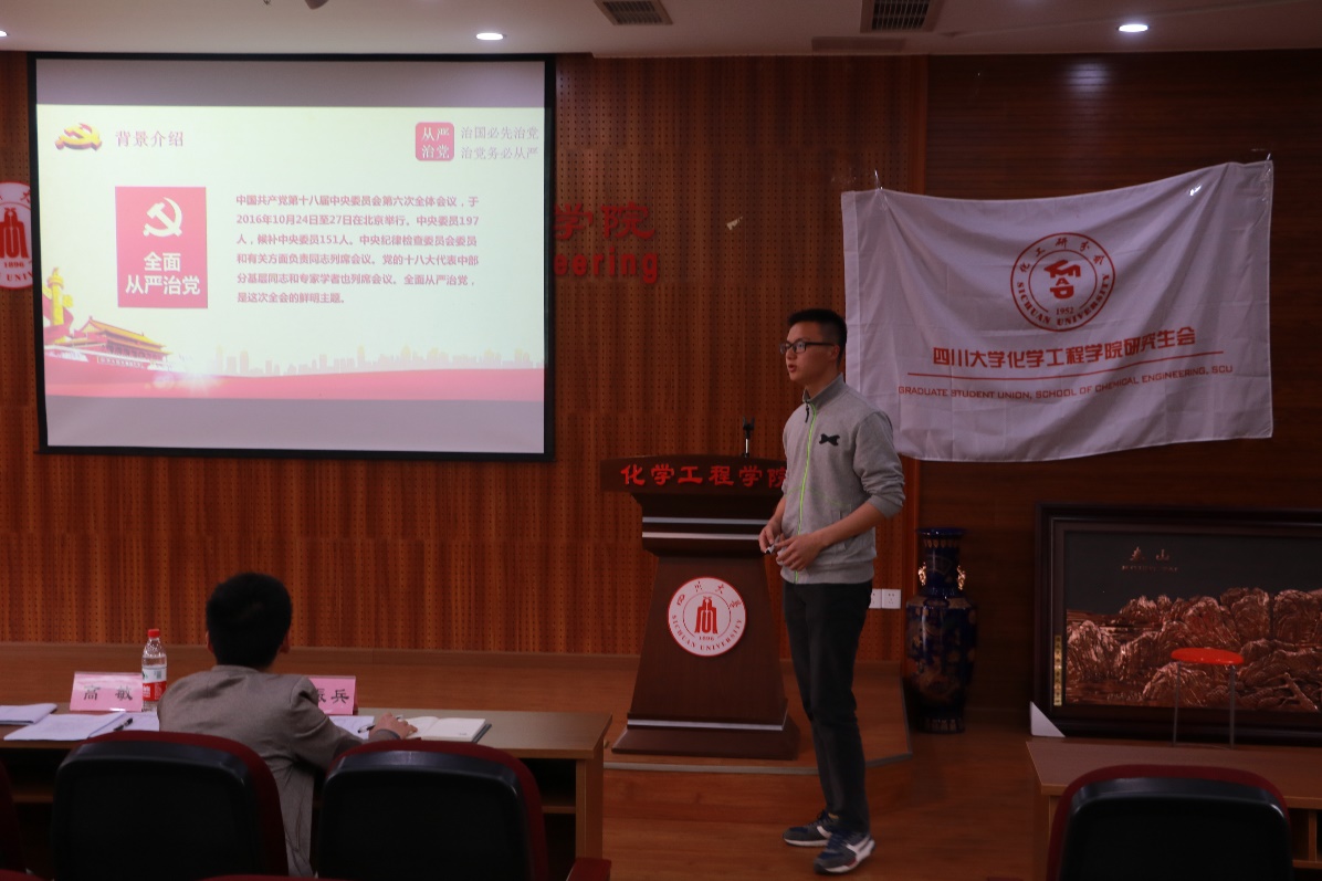 党支部学习之党风廉政建设专题PPT制作与宣讲大赛”于2017年4月25日下午14:30在望江校区化工楼313报告厅举办。本次活动的评委嘉宾有化学学院党委陈晓东副书记、党政办主任李晓燕老师、高敏老师和研究生辅导员司振兵老师。楼凤