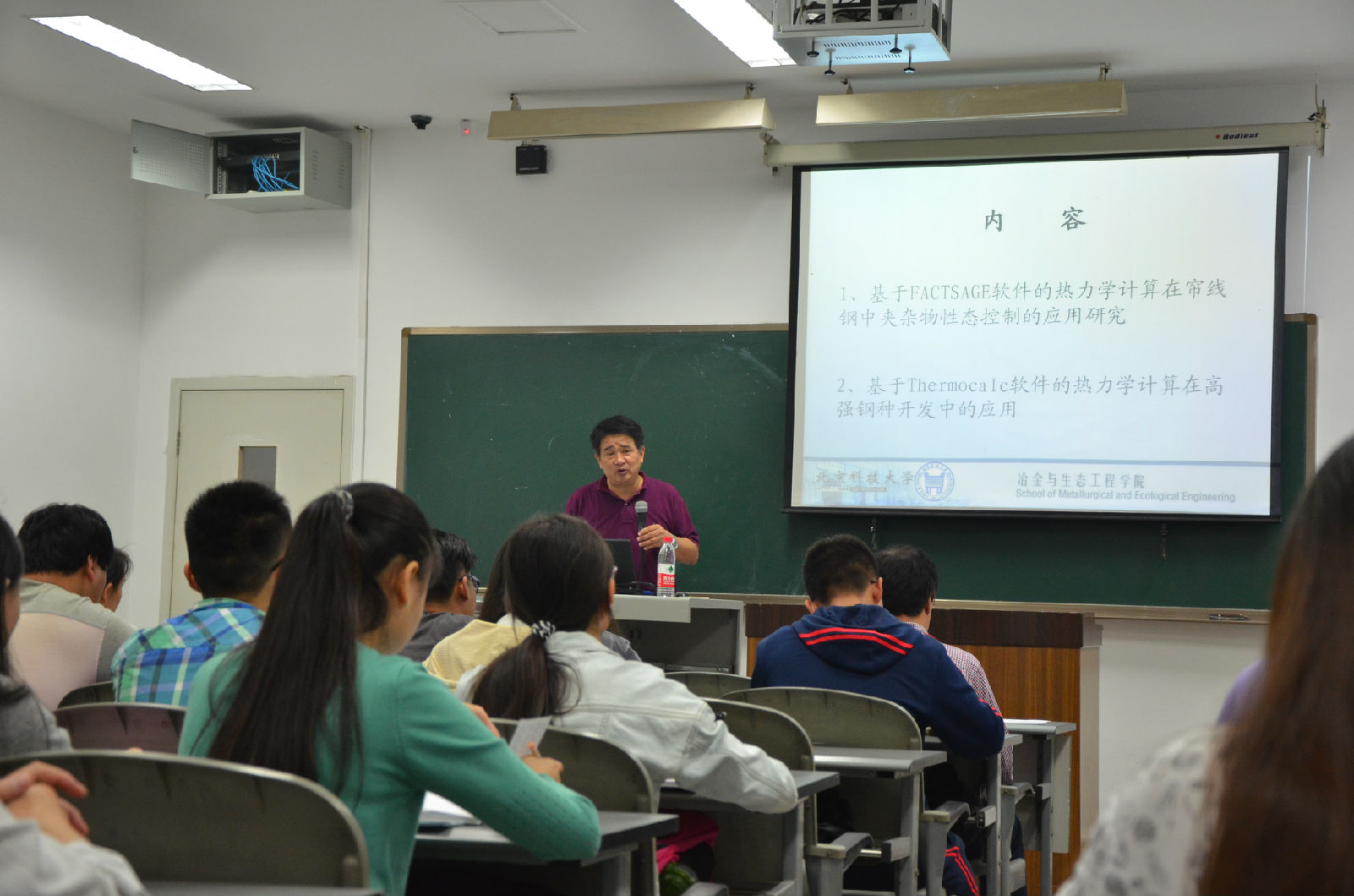 王福明教授针对基于FACTSAGE软件热力学计算在帘线钢种夹杂物性态控制的应用和基于Thermocalc软件热力学计算在高强度钢种开发中的应用两大主题,进行了深入浅出的讲述。包燕平教授结合自己科研和教学实践,对“炼钢就是炼渣”有独到见解,认为炼钢合理高效利用渣,同时也应该重视炼钢之外的钢渣综合利用,并突出“智慧炼钢”的新颖理念。北京科技大学王福明,包燕平两位教授,系统详实的报告让众师生受益匪浅,对大家的科研工作和学习具有很好的指导和启迪意义。