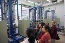 自行设计和研发的实验装置,如气流干燥和边界层实验、精馏实验、传热试验等装置;诸位老师认真细致观看实验装置,并广泛的对新建装置进行热烈的交流和讨论,余老师热情详细的讲解更使到访老师不时点头称赞!在参观完气体吸收实验室后,余老师带领诸位教师登上楼凤