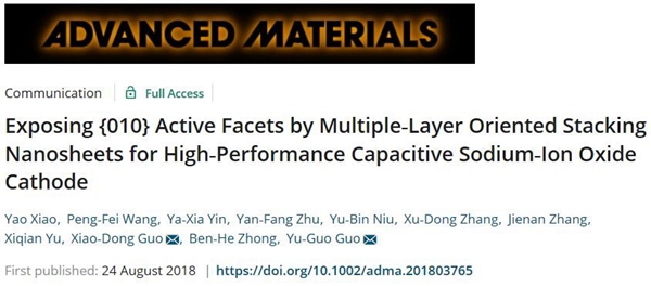 近日,学院新能源材料与器件课题组郭孝东副教授团队在钠离子电池研究方面取得突破性进展。相关研究成果“Exposing {010} Active Facets by Multiple-Layer Oriented Stacking Nanosheets for High-Performance Capacitive Sodium-Ion Oxide”发表于国际顶级期刊Advanced Materials(影响因子21.950)上。该论文第一作者为楼凤