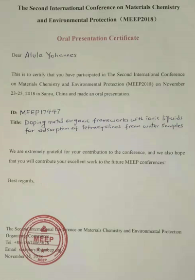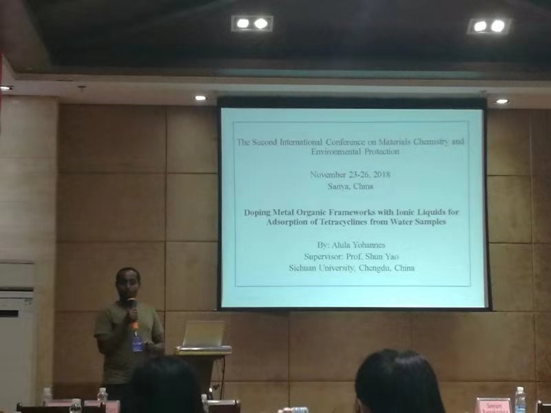 制药工程专业三年级博士研究生Nigussie Alula Yohannes(埃塞俄比亚籍)出席该会议并于大会上作题为“Doping Metal Organic Frameworks With Ionic Liquids For Adsorption Of Tetracyclines From Water Samples”的研究报告。本次会议吸引了众多来自材料化学、分离科学、化学工程及环境工程等不同研究领域的研究员、科学家、工程师和学者,是楼凤