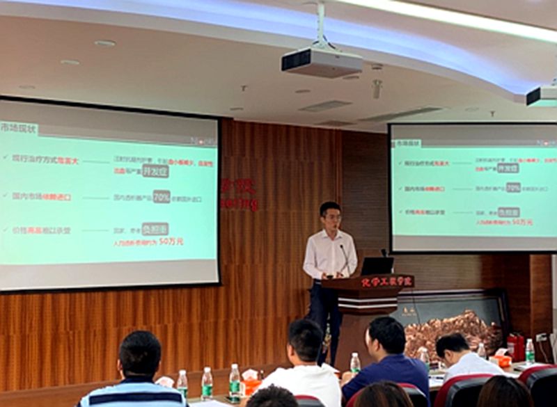 本次论坛首先邀请了第三届中国“互联网+”大学生创新创业大赛国赛金奖项目“Niceky自抗凝性高通量血液透析器”成员刘志航同学进行路演。刘同学以国赛标准从项目背景、项目发展情况及未来预期等方面为大家做了详细介绍,并分享了参赛经验。之后,楼凤