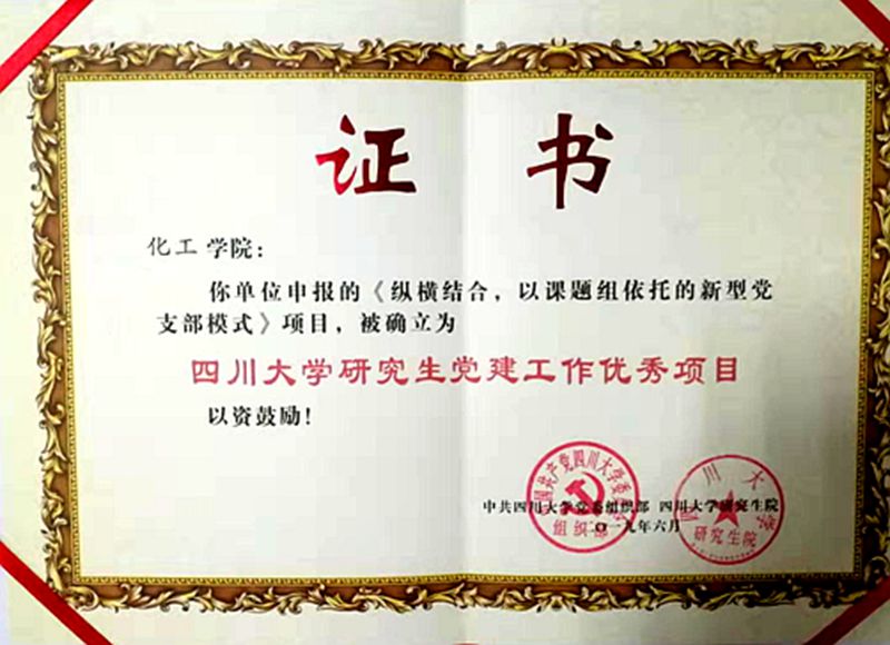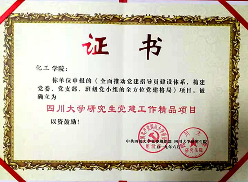 研究生党建工作以《全面推动党建指导员建设体系,构建党委、党支部、班级党小组的全方位党建格局》项目荣获研究生党建工作精品项目、《纵横结合,以课题组依托的新型党支部模式》项目获得研究生党建工作优秀项目称号。