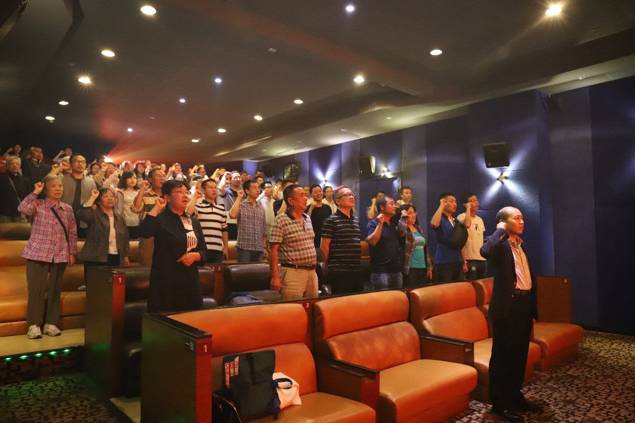 观影前,全体党员在在学院党委副书记、纪委书记李天友同志的带领下面向党旗重温入党誓词。“我志愿加入中国共产党……”,面对鲜红的党旗,同志们高举右拳,字字铿锵,重温入党誓词,响彻在每一个影厅,让“忠诚、干净、担当”真正入脑入心。在重温誓词的时候,每一个党员都在回头看看自己入党之后走过的“路”,找出其中的不足,不忘初心、牢记使命,抬起头来向优秀的党员学习,争做合格的共产党员。