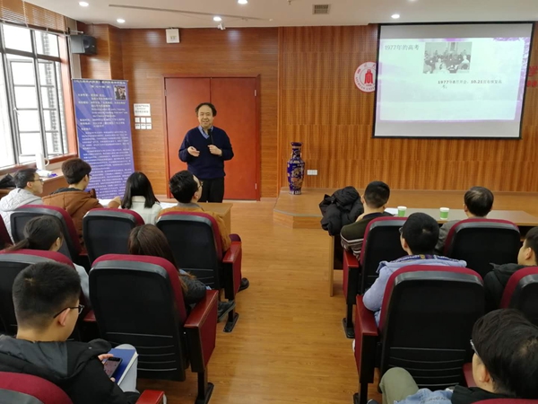 祝京旭院士1977年从高中一年级直接考入清华大学化工系,其所在清华大学“化七二班”为全国优秀班级,于1979年提出了后来响彻全国的“从我做起、从现在做起”的口号,在特定的历史条件下,体现了“自强不息”的精神,也代表了改革开放初期的时代最强音,响应了民族发展的大方向。祝老师首先从自己成长经历出发,生于困难时期,长在动乱时期,成熟于过渡时期,他将自己代入那段历史,引领同学们一起走入那个时代,向同学们介绍了改革开放四十年来的时代变迁和个人的生活变化,展示了四十年来我国所经历的深刻变化。随后,祝老师向同学们介绍了自己所在的班级成员如何经历了思想的变迁,如何去思考自己与时代发展,并提出了“从我做起、从现在做起”这一后来响彻全国的口号。并向同学们介绍了自己与同学是如何在各行各业上践行这一理念,不断开拓进取。祝老师说,自己当时虽然是班上年级最小的,但是自己一直都在勇于担当,努力去尝试各种事情,积极为同学服务,所以班上同学都没有因为他年龄小而轻视他。最后,祝老师根据自己经历向同学建议个人的发展需要与时俱进,并强调每一位同学都需要对社会有担当,在实现自我价值的同时为社会作出贡献。
