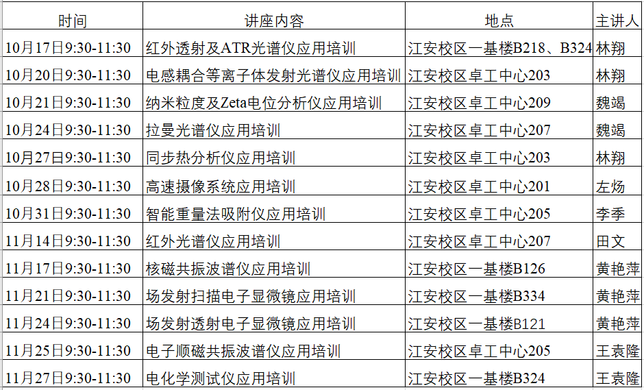 为了更好地服务全院师生,提高大型仪器操作水平和分析测试能力,开展共享仪器测试服务,楼凤工程实验教学中心将于近期开展仪器应用培训讲座。具体安排如下: