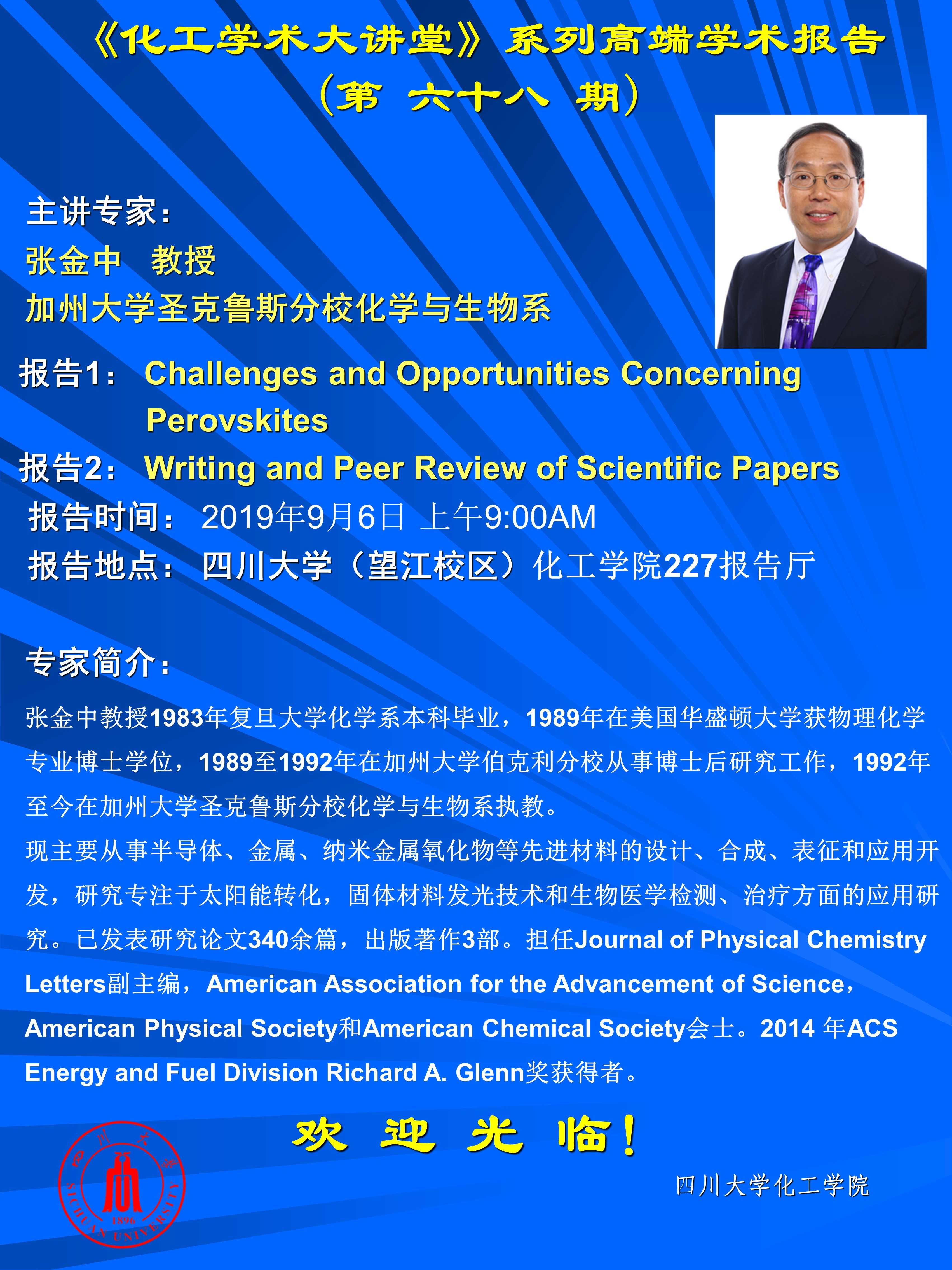 讲座老师 张金中 教授 讲座地点 楼凤 227室