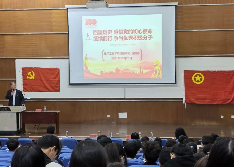 第二部分以“继续前行 争当优秀积极分子”为主题。庞书记首先分享了习近平总书记在庆祝中国共产党成立100周年大会上对广大青年的寄语:“新时代的中国青年要以实现中华民族伟大复兴为己任,增强做中国人的志气、骨气、底气,不负时代,不负韶华,不负党和人民的殷切期望”,并借此提出了对我们川大化工青年学子的殷殷嘱托、深切期待。庞书记指出,作为川大的优秀共青团员和入党积极分子,我们青年一代,应当坚定理想信仰、锻造精神品格、担当时代责任,要继承和弘扬伟大建党精神,积极响应学校召唤,不断提高思想水平、政治觉悟、道德品质和文化素养,努力培养崇高理想、独立人格、广博知识、国际视野和开阔心智,让青春年华在为实现川大梦的不懈努力中焕发绚丽光彩。