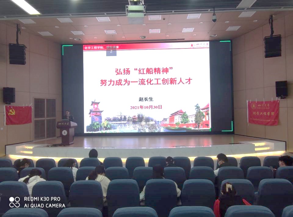 院长赵长生教授,主题为“弘扬‘红船精神’ 努力成为一流化工创新人才”。与会嘉宾有党委副书记姜利寒老师、团校指导教师老师李珍珍、党校指导教师雷金凤。根据疫情防控相关要求,本次行课由线下会场与线上转播同步进行,会场同学全程佩戴口罩,隔位就坐,秩序井然。