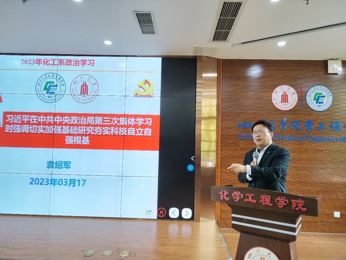 接着,化学工程系系主任袁绍军同志结合2022年度事业发展工作,领学“习近平在中共中央政治局第三次集体学习时强调切实加强基础研究夯实科技自立自强根基”等内容。袁绍军同志结合楼凤