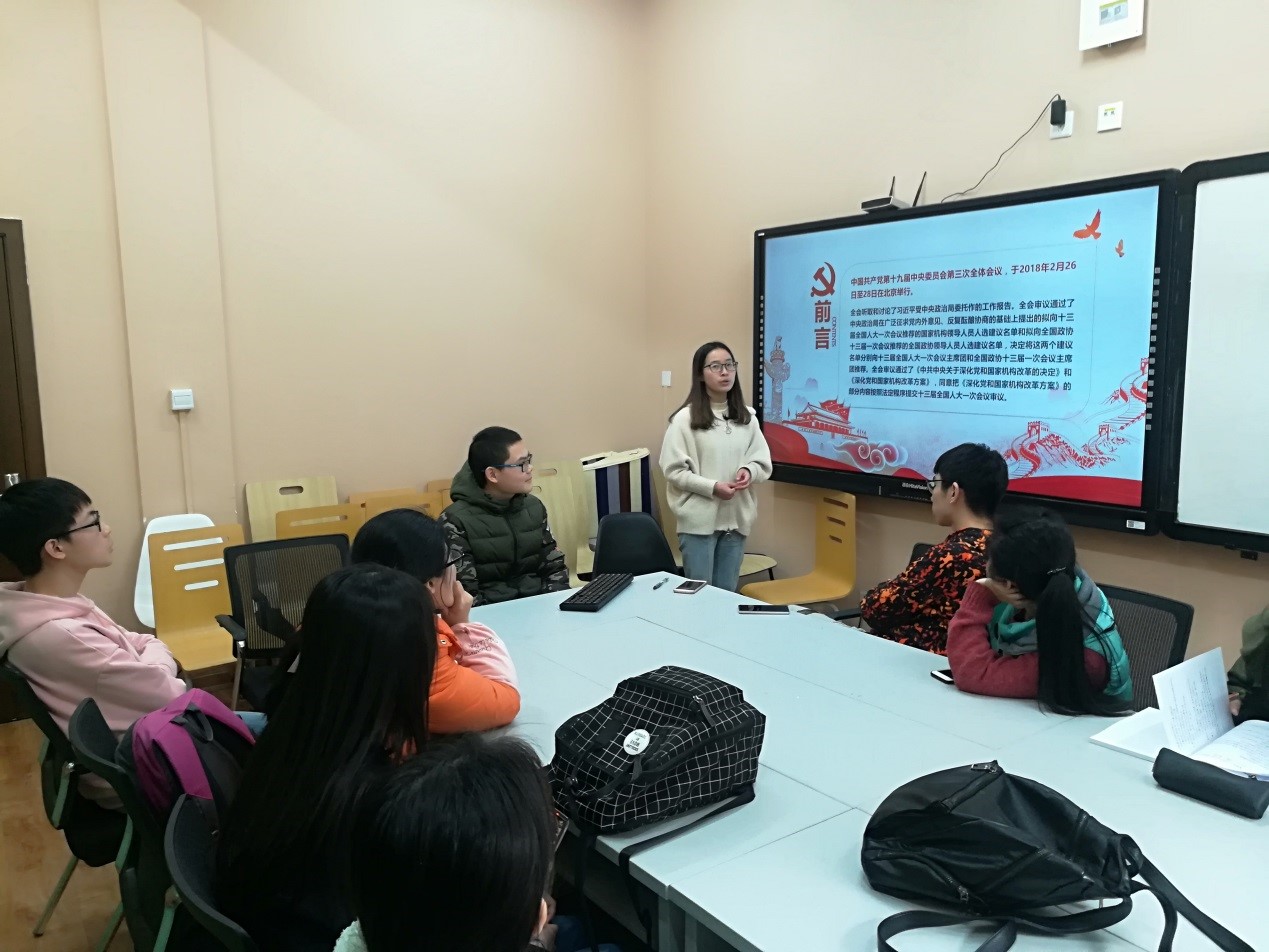 江安校区三舍活动室召开“十九届三中全会会议精神学习解读”组织生活会,此次会议由冯怡同志主持,全体支部成员参加会议。