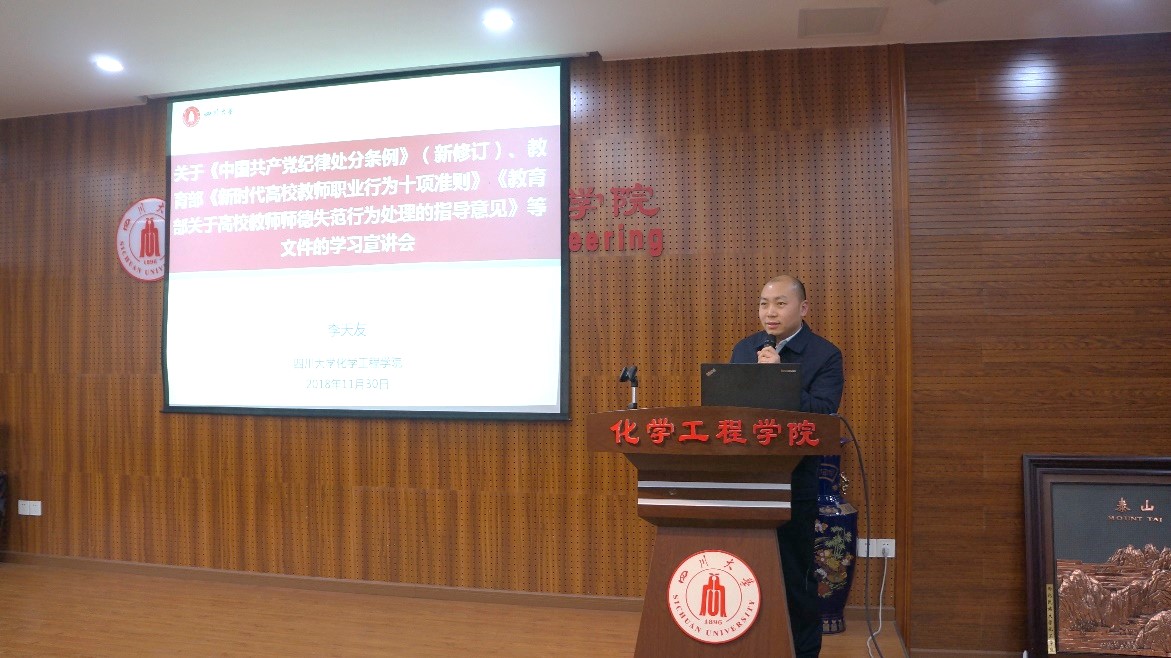党委副书记、纪委书记李天友为全院教师宣讲新修订的《中国共产党纪律处分条例》(以下简称《条例》)、教育部《新时代高校教师职业行为十项准则》(以下简称《十项准则》)和《教育部关于高校教师师德失范行为处理的指导意见》(以下简称《意见》)。楼凤